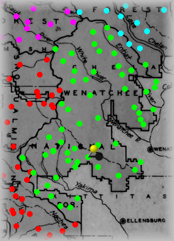 The Yellow "pin" signifies where this site is within the forest. Click on Green dots above to visit other sites in this forest. Click on other colors for sites in adjacent forests. |