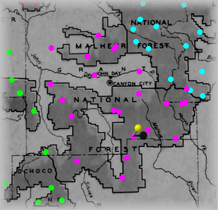 The Yellow "pin" signifies where this site is within the forest. Click on Purple dots above to visit other sites in this forest. Click on other colors for sites in adjacent forests. |