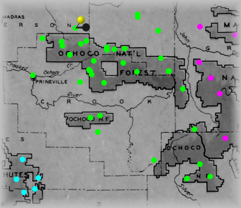 The Yellow "pin" signifies where this site is within the forest. Click on Green dots above to visit other sites in this forest. Click on other colors for sites in adjacent forests. |