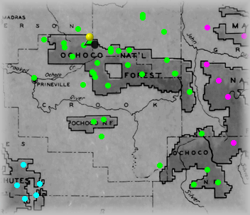 The Yellow "pin" signifies where this site is within the forest. Click on Green dots above to visit other sites in this forest. Click on other colors for sites in adjacent forests. |
