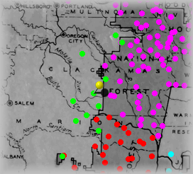 The Yellow "pin" signifies where this site is within the forest. Click on Green dots above to visit other sites in this forest. Click on other colors for sites in adjacent forests. |