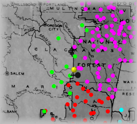 The Yellow "pin" signifies where this site is within the forest. Click on Green dots above to visit other sites in this forest. Click on other colors for sites in adjacent forests. |