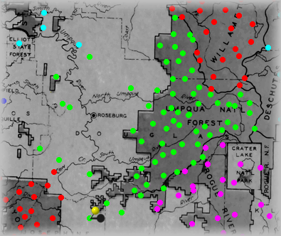 The Yellow "pin" signifies where this site is within the forest. Click on Green dots above to visit other sites in this forest. Click on other colors for sites in adjacent forests. |